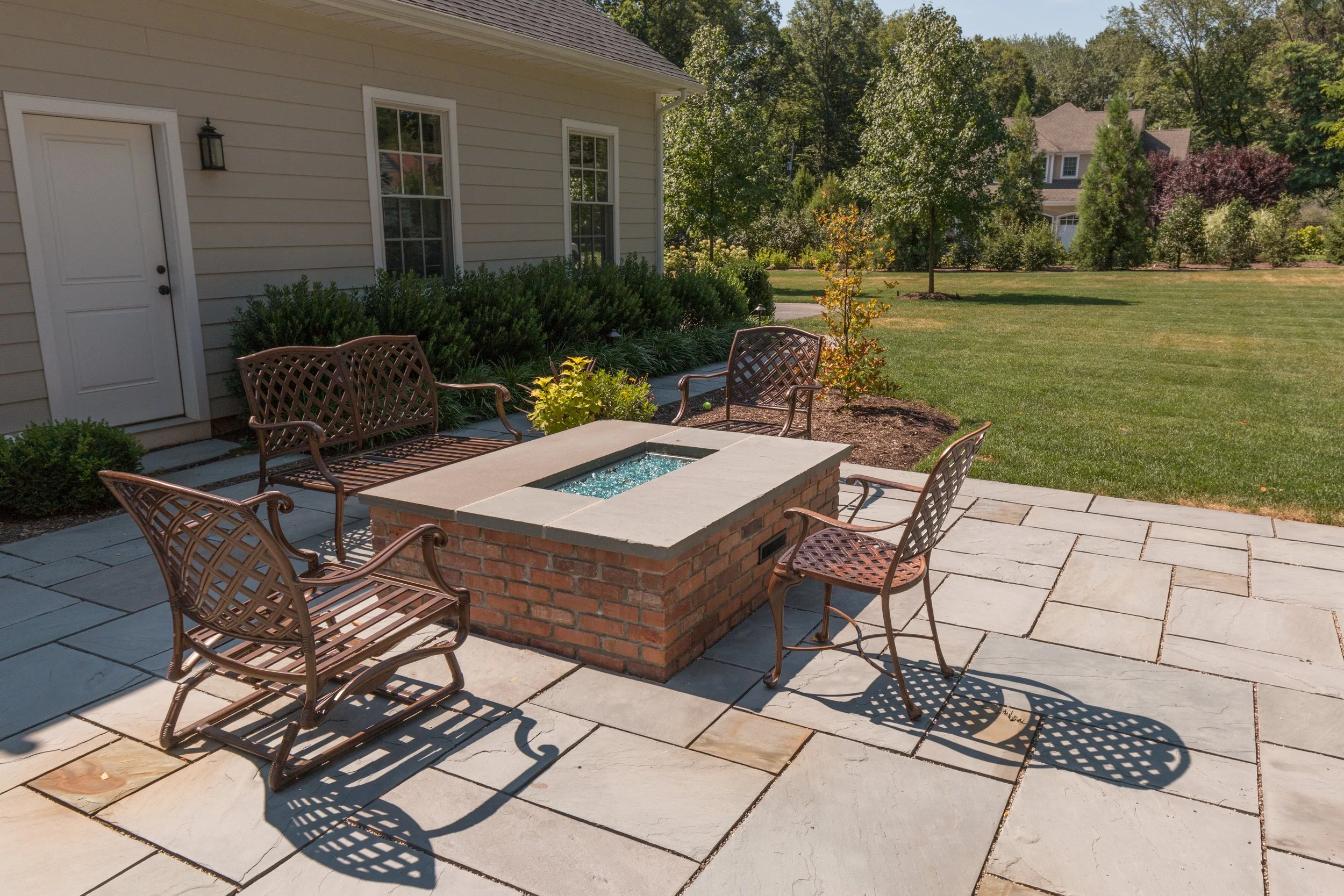 The newly constructed home in Morristown-Westminster, NJ faced the task of incorporating a variety of outdoor elements—water, fire, an outdoor kitchen, patios, seating areas, and defined paths—while maintaining a clean, uncluttered appearance. The design needed to mirror the building’s masonry, so that the landscape felt like a natural extension of the home.