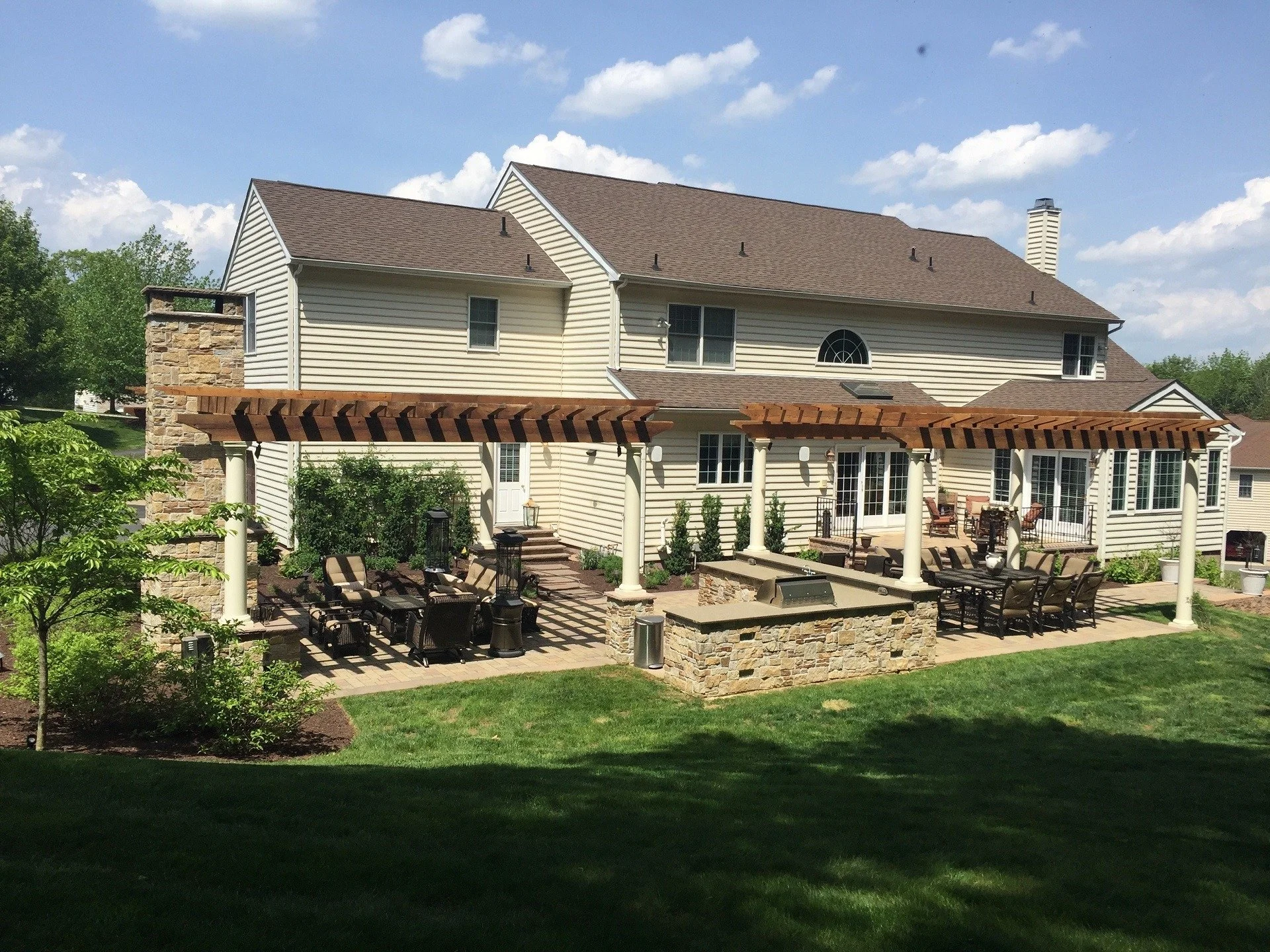 Now, this homeowner enjoys a beautifully designed outdoor space where guests move naturally from one inviting area to the next. Every detail — from the stonework to the pergola — reinforces the home’s elegance while providing the perfect setting for connection and relaxation.