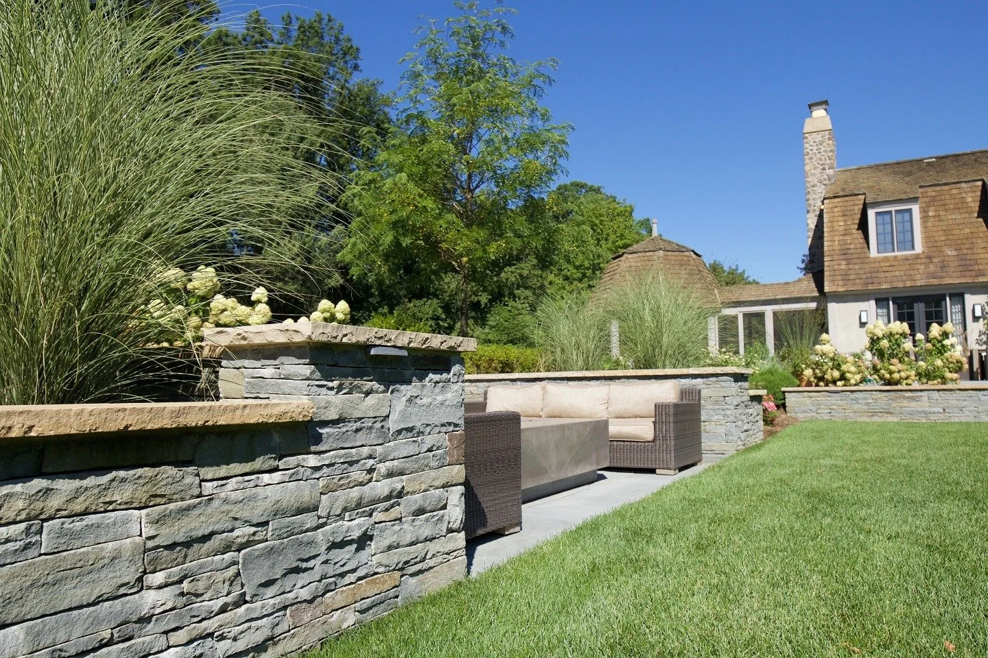 A homeowner in New Vernon, NJ, sought a formal landscape design that would complement their charming country home and serve as a refined setting for gatherings. The goal was to integrate multiple outdoor elements—patios, fire features, gardens, walkways, and an outdoor kitchen—into a harmonious layout that offers both beauty and functionality.
