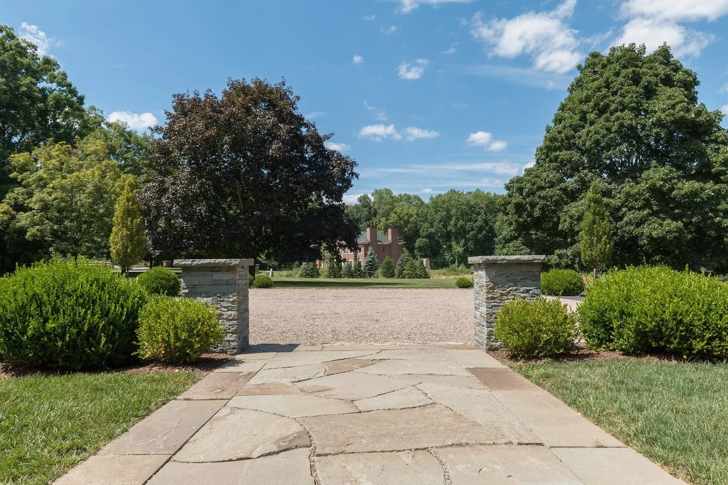 Structured Entry: Crafted an entryway framed by stone pillars along a broad flagstone walkway to create a distinguished arrival experience.